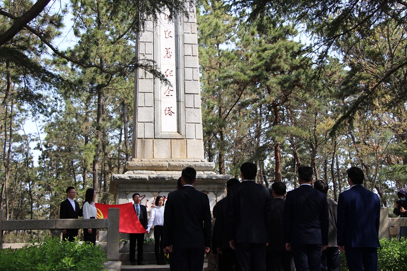天福山起义纪念碑四周苍松翠柏,古木参天,一派庄严肃穆,参加活动的党员和教师排队逐个敬献鲜花,祭奠烈士。
